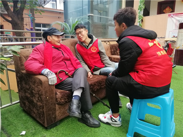 志愿者们一口爷爷奶奶,亲切地叫着,让老人们感受到陌生却又近似家人的温暖,即使不是他们的孙子孙女,在这一刻也显得格外的温情。有些老人热情大方,拉着志愿者就聊起了家常,讲诉着自己的阅历。人生就像一本历史册,年龄越大,阅历就越丰富。见到志愿者就如同见到下班回家的儿女们,回到了家把自己这一天所经历的事情一股脑的全说出来才好受一般,即使两人是素未谋面。有些老人比较不善于交谈,,但看着那温情的眼神,我们知道那是温暖人心的爱。不一会儿,便听到了老人歌唱的声音,几位志愿者随着歌声拍手打着节奏。原本冰冷的庭院里一下充满了温度。人老了真的就跟小孩一样,时常带着一颗真实善良的心,但由于缺少人们的关怀,那扇藏着宝藏的门也时常紧闭着。志愿者们的到来刚好能融化那冰冷的枷锁。