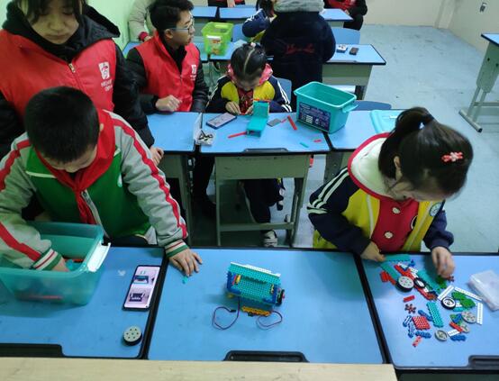 带着点点光芒而熟悉依旧的126路公交车缓缓向我们驶来,带着一个个梦想种子来到青少年活动中心。一进入教室小朋友们就激动的围了上来“老师,快让我们看一下今天要组装的机器人。”我们今天组装足球机器人志愿者回答道;小朋友兴奋的回到位置上做起了作业,期待着活动的开始。