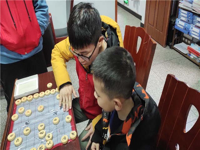 为了培养小朋友们的学习兴趣,陶冶情操,锻炼思维和手的反应能力,在小朋友们完成作业以后,志愿者们还跟小朋友下了象棋。首先,由志愿者们给小朋友们介绍象棋的历史文化和游戏规则,再教他们一些基本的下棋方法,然后志愿者们带领小朋友一起进行了实践操作,让他们之间互相进行象棋比赛,同时也增进了小朋友之间的感情。还有一部分的小朋友在白板上画画,他们天马行空的想象力在白板上体现得淋漓尽致。一笔一笔画出的不仅是一些奇妙的图案,更是他们童真的体现,紧接着欢声笑语就充满了整个房间。