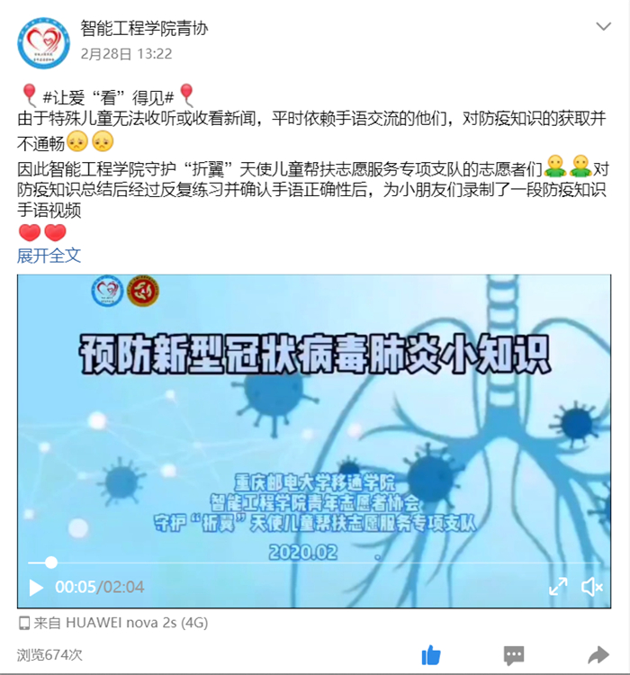 智能工程学院守护“折翼”天使儿童帮扶志愿服务专项支队的志愿者们考虑到特殊儿童无法通过收听或收看新闻接收到足够的防疫知识,平时依赖手语交流的他们,对防疫知识的获取并不通畅,因此志愿者们在对防疫知识总结后,队员们经过反复练习反复纠正动作,确认手语正确性后,为小朋友们录制了一段手语防疫知识视频,用认真为这群“折翼”天使提供保护和帮助。