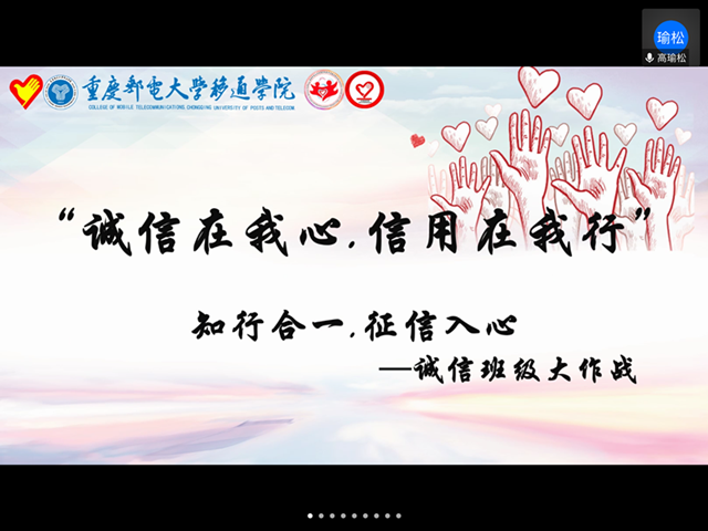 诚信班级大作战持续了整个诚信月。参赛班级在规定时间段策划并开展活动。各个班级在此次活动中竭尽所能,在线上也能尽显本班的风采。4月29日下午,班级完成答辩并产生了三个诚信宣传类班级及三个诚信实践类班级。此次“诚信在我心·信用在我行”诚信月活动画上了完美的句号。