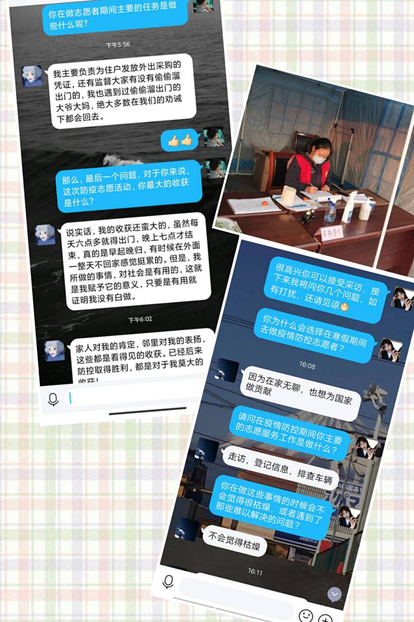一个人的走访调研,是枯燥乏味的,但看到愿意填写调查问卷和接受采访的人们,那些枯燥、疲劳都烟消云散了。在居民社区调查时,由于年龄段不统一,就需要采用不同的方式方法完成此次调研。广泛的调研群众与受众人群,大大提高了调查效果的最优化。90后、00后在此次疫情防控的大局下,展现了有担当、义不容辞的青年品格。小小的基层志愿者,藏着大大的能量,通过采访地区的疫情防控志愿者,发现志愿活动可以影响很多人,他们并不认为做志愿者很麻烦,而是认为这样的机会很有趣、很难得。其中,有位被采访者说道:“在奉献的过程中,收获了认可与肯定,给我带来了快乐。”这样的精神值得所有人去学习,调研的过程与采访都是别有一番趣味,听着他人的分享,回看当下的形式,展望美好的未来。