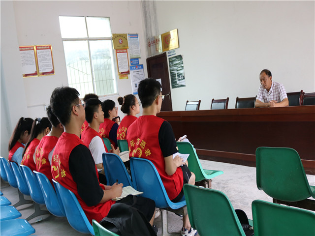 伴随着清晨的细雨,志愿者们踏上了东风村的行程。参观完村委会后,志愿者们对农家书屋进行了清洁整理,焕然一新。随后,村书记黄忠德向志愿者们介绍:东风村占地面积273.58公里,人口3957人,是一个中等乡村。其中高龄人口占总人数的八分之一,外出人口1800人,占总人数的百分之四十五,人口老龄化较为严重。近年来,村内开展了乡村振兴工程,修建了美丽整洁的沥青公路。在脱贫攻坚这一时代背景下,东风村因地制宜,让特色生态产业与本地资源相融合,建设出一个生态宜居、乡风文明的小康乡村。