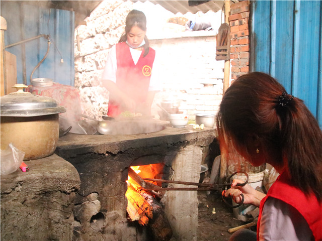 时间转瞬即逝,忙碌了一上午的志愿者们在爷爷奶奶家中主动请缨,“占据”厨房打算为爷爷奶奶准备一顿丰盛的饭菜。一位志愿者跟着爷爷去山上寻找午饭的食材,爷爷一边走一边讲述着他辛勤劳动种地的故事,眼帘一排排的农作物体现了那句老话:谁知盘中餐,粒粒皆辛苦。寻找完食材后,在看到爷爷奶奶家中有些灰尘的厨房餐具时,志愿者们又立刻动了起来,使锅碗瓢盆焕然一新,注意饮食卫生不仅仅是对自身负责,更是对爷爷奶奶负责。志愿者们各司其职,在厨房中穿梭忙碌着,一整套流水线运营而生。虽经历了一上午的辛苦劳动,但志愿者们仍践行着无私奉献精神,没有一丝抱怨。在准备工作一切就绪后,柴火点燃,老式农家煮饭的烟火气息弥漫整个厨房,正映衬着他们的名字:红色烟火志愿服务团。