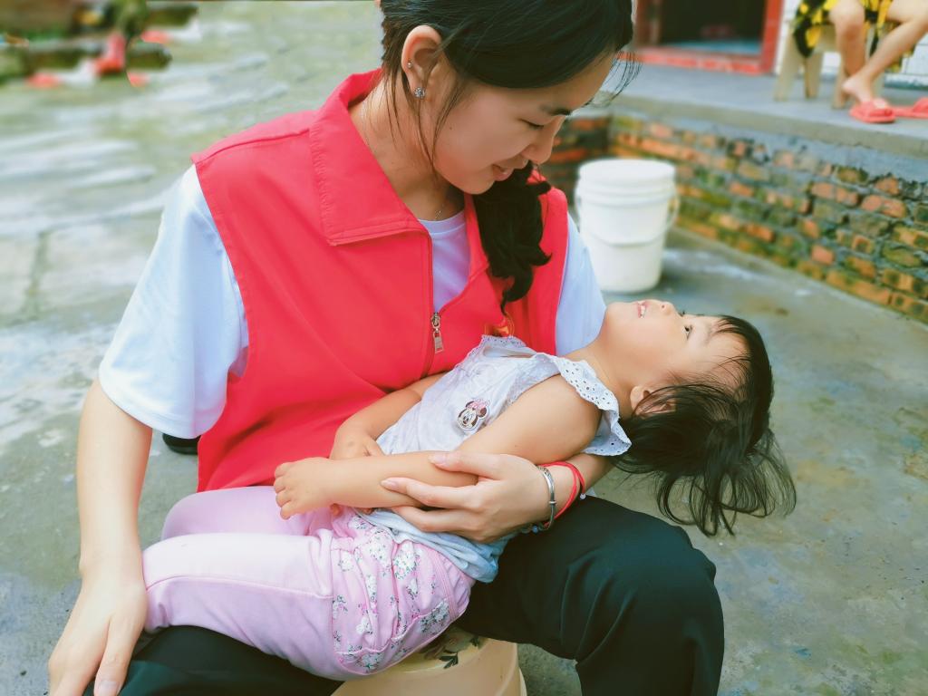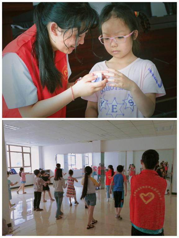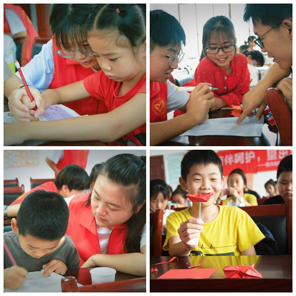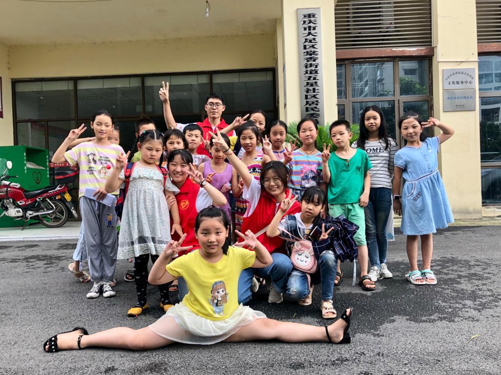 清晨的天空有朦朦细雨,也无法撼动五星村红色身影的屹立。这抹亮眼的红从村口走进课堂,穿梭在声情并茂的《观沧海》朗诵;摇曳在动若脱兔的《小苹果》舞蹈;亦荡漾在走廊悠扬动听的《小白船》里。志愿者言传声教,鼓励小朋友以兴趣为导向勇敢展现自己,在实践中结识伙伴,连接情谊。用心呵护,笑颜与童真一齐交汇在五星村大队,绽放出七彩的光辉。