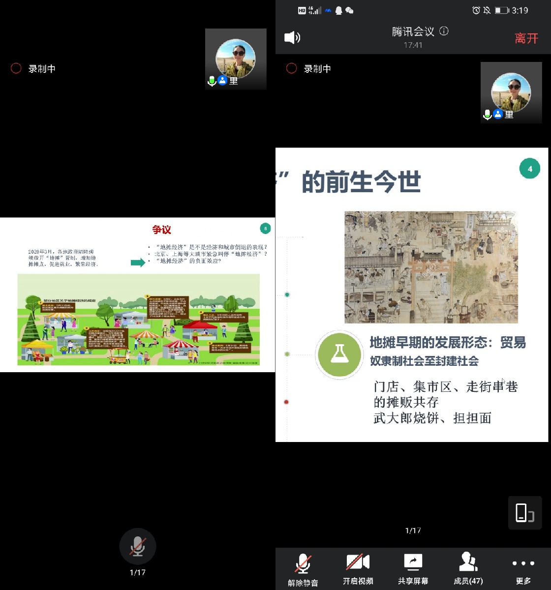 其次,又从“地摊经济”的前生今世给同学们做了简短的介绍,讲述了地摊经济在不同时期的发展形态和发展状况,让同学们对地摊经济有了更深层次的了解,让地摊经济如雨后春笋般的兴起变得有理可寻。紧接着,又引出当今社会存在的一大争议:一边各地政府放宽政策促进地摊经济的繁荣,另一边北京、上海等大城市紧急叫停“地摊经济”。对此争议,留给同学们无限思考的空间,再者,给同学们完整而全面的讲解了地摊经济的概念。