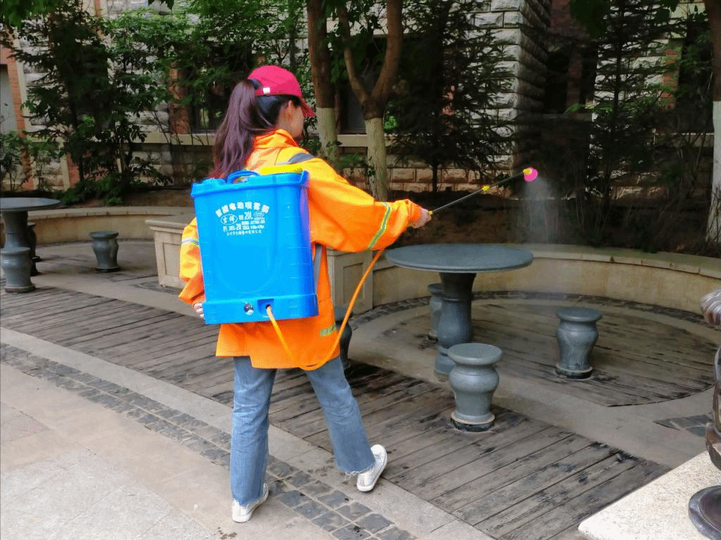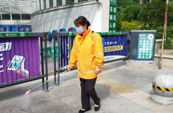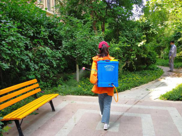 疫情就是命令,防控就是责任。目前,虽然疫情得到了有效的控制,但是每天的消毒依旧是小区物业的日常工作。小区物业每天都会安排园林消杀工作,消杀用的桶装消毒水足足有20升,背在身上十分沉重,在这炎热的夏天里,穿着厚重的防护工作,不到半个小时就汗流浃背。尽管如此阿姨们也从不抱怨,认认真真的做着自己的工作,为疫情防控贡献自己的力量。