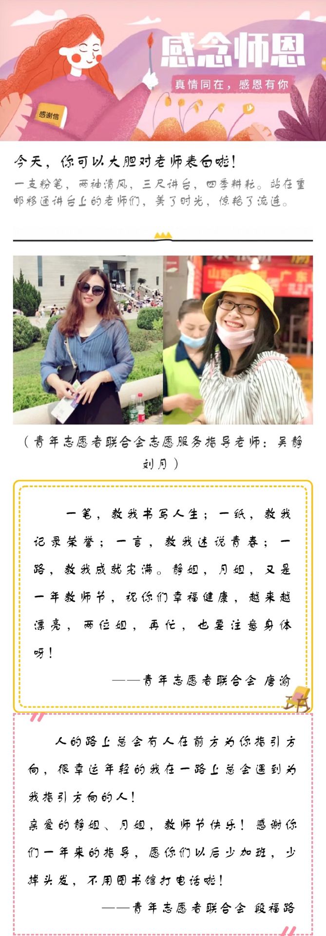 笔尖凝暖意,字字诉师恩。通信与物联网工程学院青年志愿者协会号召同学们写下最美的文字献给最敬爱的老师,通过“尊师心语之三行情书”、“尊师心语之祝福袋”、“师生印像馆”、“除尘送恩情”等活动,表达同学们对老师的感恩和祝福,用实际行动表达对老师的敬意。