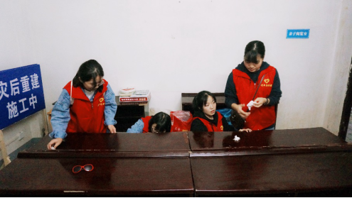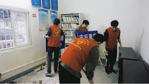 打开尘封的红色的大门,灯光闪烁了两下,立刻就乖了下来,打开连接外界的窗户,新鲜的空气将酝酿已久的空气赶出这个美丽的房间。对于志愿者来说,不管顽皮的雨水留下多少污渍都算是小菜一碟。志愿者们用扫帚把垃圾全部将它们带到应该待的位置。四个小桌子拼成一张大桌子,这些桌子即将承担沉重的知识。接下来男生们将一袋一袋的书从隔壁搬到了这个焕然一新的房间。一切都准备就绪,在这个房间,小朋友们可以自由地在知识的海洋里征服星辰大海。