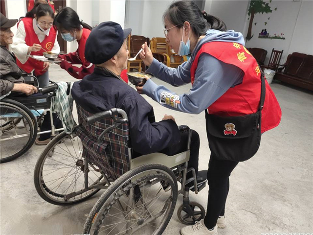 进门的一瞬间他们便开始了行动,可以明显的发现,刚开始志愿者们还有一点羞涩放不开,但却因为心中强烈的为他人服务的意愿,推动着他们放下了心中的羞涩,朝老人们迎了上去。有的志愿者将颤颤巍巍的老年人从厨房搀扶到大厅;有的志愿者在陪老人聊天,舒畅他们的心情。最让人记忆深刻的无疑是有几个志愿者拿着滚烫的饭碗喂老人吃饭。他们自己忍受住饭碗烫手的温度,不曾将饭碗离手,把饭慢慢的用勺子舀起来再轻轻地吹一口,为了使之温度降低,最后又慢慢的,送入老人的口中。每一个步骤都是对爷爷奶奶们的体贴,是对志愿的诠释。因为身体的原因,老人们的饭菜看着很单一,蔬菜粥加了些南瓜罢了,但那漫长而又短暂的半个多小时的喂饭过程却使得这粥不再单调。因为粥里充满了无限的耐心与爱心。