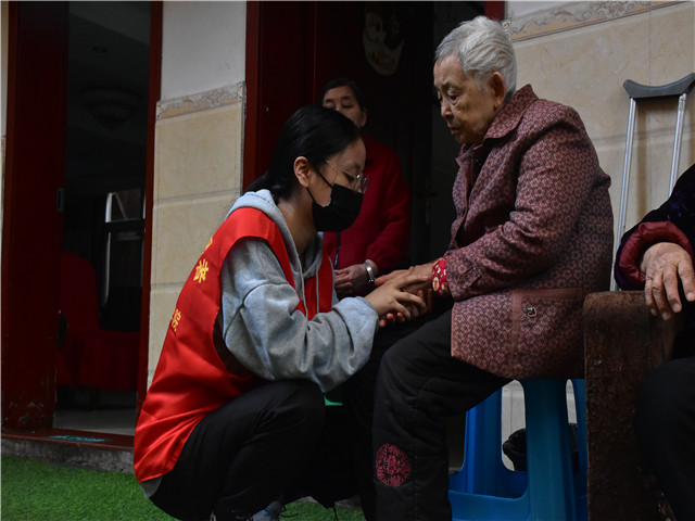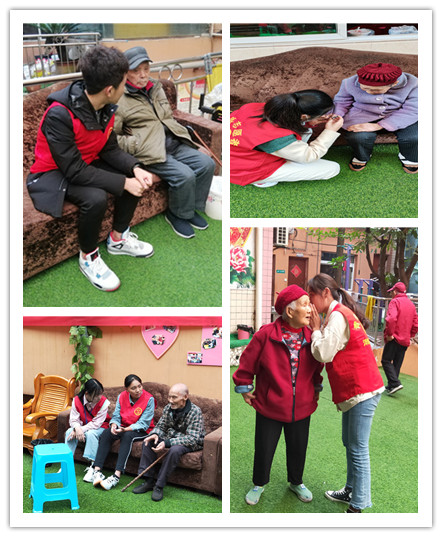 几经周转,志愿者们来到了合川区康乐老年公寓,在队长的安排下,志愿者们有组织的分为若干个小组,各有分工:有的走进老人的房间,一边捶腿一边与他们唠家常、讲笑话,虽然有语言不通的外地小伙伴,但他们也积极融入进去,用刚学习的方言向老人们问好;有的在院子里和老人一起唱歌,给老人们带去欢乐;有的帮助老人打扫卫生,整理出老人的衣服,让他们穿上自己喜爱的新衣......其中,与老人一起唱歌的形式受到了老人们热烈的反响——《我和我的祖国》、《东方红》、《我的祖国》等一系列经典老歌,让老人们不禁回想起属于他们的年代,在志愿者们的歌声当中有不少老人都红了眼眶,这不禁让人感慨:如今的幸福都是老一辈辛辛苦苦打拼出来的,作为新时代的接班人更应该好好学习,积极拼搏,为中华民族伟大复兴而努力!