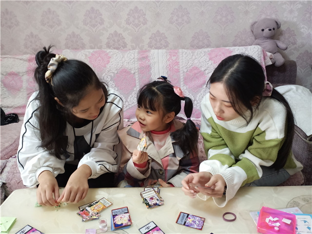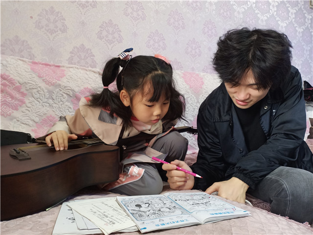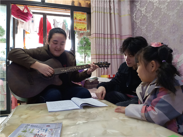 志愿者们用热情的言语和精彩的表演陪伴着小歆艺,画着插画,叠着折纸,扮演着小故事等等。志愿者弹着吉他,传出美妙而又简单的乐音,对乐器弹出的音色甚是吸引小歆艺,于是小歆艺逐渐放下心里的羞涩,缠着志愿者们开始学习吉他。小小的手指在六根琴弦上拨动,传来的不仅是悦耳的音调声,还有久久陪伴的温暖。在进行小花仙的纸牌游戏中,迎来了歆艺伙伴的加入,热闹的氛围更加浓厚,欢乐的加倍增长。