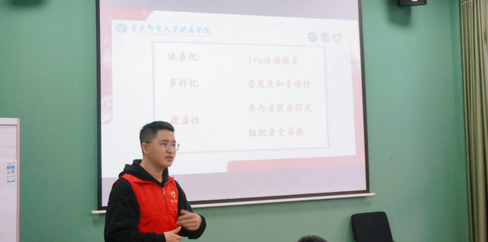 重庆邮电大学移通学院大数据与软件学院青年志愿者协会主席陈益同学上台用简洁的语言讲述了我们在活动中掌握的技巧。他告诉我们:计划活动一定要体系化、多样化,最后还要考虑收益性。首先体系化中介绍了1+X体系,即为一个主要大型活动周围要围绕很相关活动来相辅相成。此次多样性提到了既要达到一定的普及性的活动还需要专向性的活动。最后收益性指参与者从活动组织者身上能够学习到的工作技巧与技能。重庆人文科技学院青年志愿者联合会主席刘鸿飞同学告诉我们,由于疫情原因,团队尤其重视整体性。这样可以在传达信息以及完成工作的过程中省去很多不必要的人力和时间,做事可以达到更高的效率,并且有效地带动所有人干事的积极性。