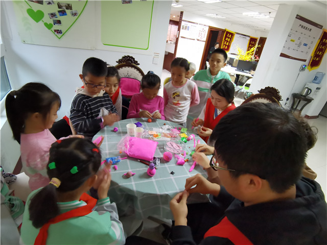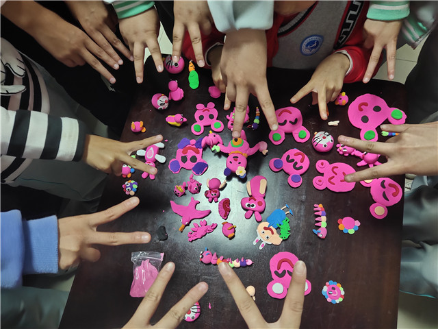 功课辅导结束后,志愿者们带领小朋友一同进行了捏泥小游戏。已经坐了很久的他们表现出了浓郁的兴趣,一个个跃跃欲试。相信每个人的心中都住着一个小孩,他们都渴望像无忧无虑的孩子一般用彩色泥土捏出一个个富有创意的小玩意儿,志愿者们也不例外。小朋友们尽情玩耍,自在欢笑,大厅里洋溢着银铃般干净悦耳的孩童笑声,让志愿者们不禁也怀恋起了儿时的美好记忆。小朋友们时不时地让志愿者们帮忙给他们的作品提建议,做修改,多么地和谐快乐。小朋友们在自己动手和志愿者协助下完成了许多可爱且富有创意小作品。为了记录下这一温馨快乐的时刻,志愿者们还邀请小朋友们手拿自己的作品一同拍照,让照片将快乐永远收藏。
