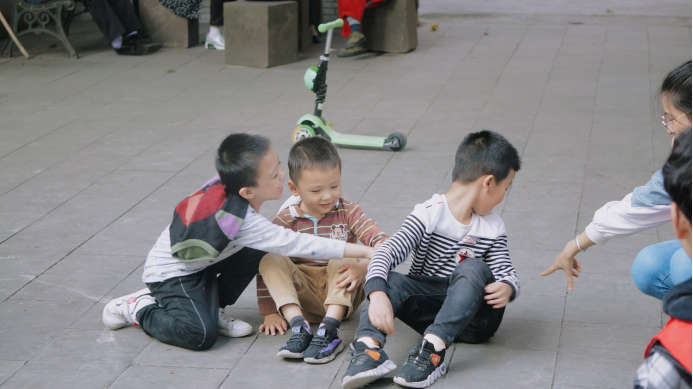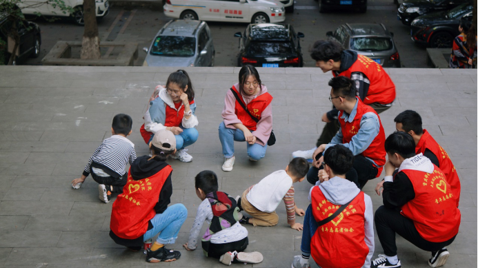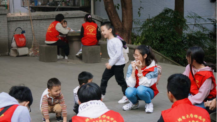 孩子们冲向志愿者,便用那稚嫩的小手拉起志愿者的手,大家一起围成一个圈,随意地席地而坐玩起了丢手绢,小朋友欢快地在志愿者身边围绕,他悄悄地丢下手绢捂着小嘴乐呵呵地跑到自己的位置坐了下来。有时手绢被放在小朋友身后,边上的小伙伴笑着说:“在你身后,快追!”小朋友先把手绢拿起来再自己大笑着站起来去追上一个小朋友。孩子的笑声总是那么纯洁又美好,直击志愿者的心灵,消解心中的劳累。