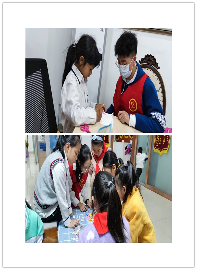 功课辅导结束后,志愿者们带领小朋友一同进行了捏泥小游戏。他们都是无忧无虑的孩子,用彩色泥土捏出他们想要的形状。另外志愿者也提供小孩拼图,面对小朋友拼图志愿者自愧不如,小朋友知道拼图技巧,而志愿者面对拼图无从下手。小朋友们尽情玩耍,大厅里洋溢着志愿者和小朋友的欢声笑语,让志愿者们不禁也怀恋起了儿时的美好记忆。拼图的大功告成,小朋友满脸的开心。为了记录下这一温馨快乐的时刻,志愿者们邀请小朋友们手拿自己的作品一同拍照,让照片将快乐永远收藏。