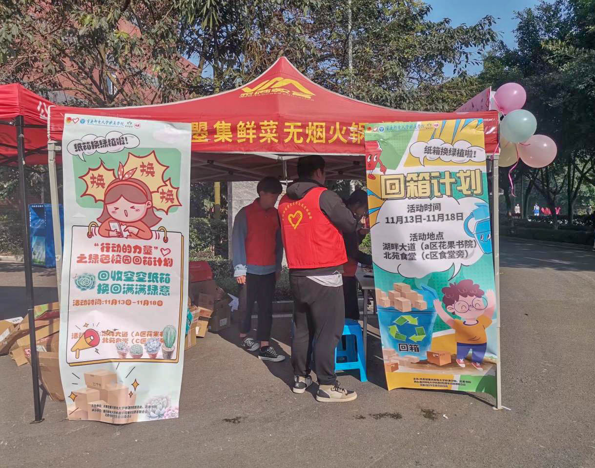 绿动校园,环保至上,为响应国家生态文明建设的号召,更好地向全校师生以及社会传达绿色环保的生活理念。11月11日—18日,校团委联合花果书院开展了行动的力量之为期八天的回箱计划,旨在让每一位参与活动的同学从资源循环的“旁观者”变成“实干家”,增强当代大学生参与环境保护的责任感和使命感,为学校环境保护做出自己的贡献。