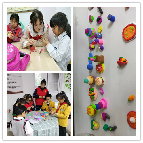 在志愿者们的辅导下,孩子们迅速地完成了作业。接着,志愿者用带来的超轻黏土,和孩子们做了小猫、汉堡、披萨、可乐等形态各异的作品。过了一会儿,童“yi”小课堂志愿服务支队和心语娃娃特殊教育服务支队共同合作带来手语操表演,孩子们似乎对手语操很感兴趣,也跟着志愿者们做起动作。在欢声笑语之中,孩子们和志愿者的心,仿佛融为一体。
