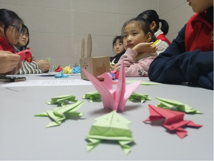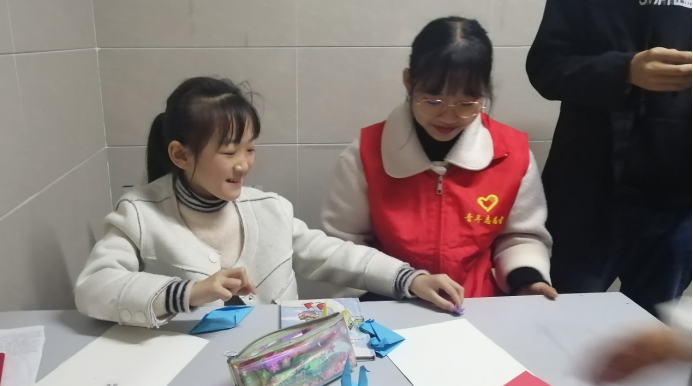 最后的折纸游戏,志愿者教小朋友的折纸丰富多彩,教的过程也让小朋友体会到了志愿者的热心。为了增加小朋友的自信心志愿者们请求小朋友教大家折兔子,随后还有“东南西北,折青蛙”,这些游戏不仅能使小朋友有开心快乐的童年和自信心的提升也能让小朋友体会到志愿者的帮助和爱心。可是快乐的时光总是短暂的,小朋友和志愿者挥手道别后就各自回家了,相信志愿者的每一次陪伴都能使小朋友获得开心快乐。