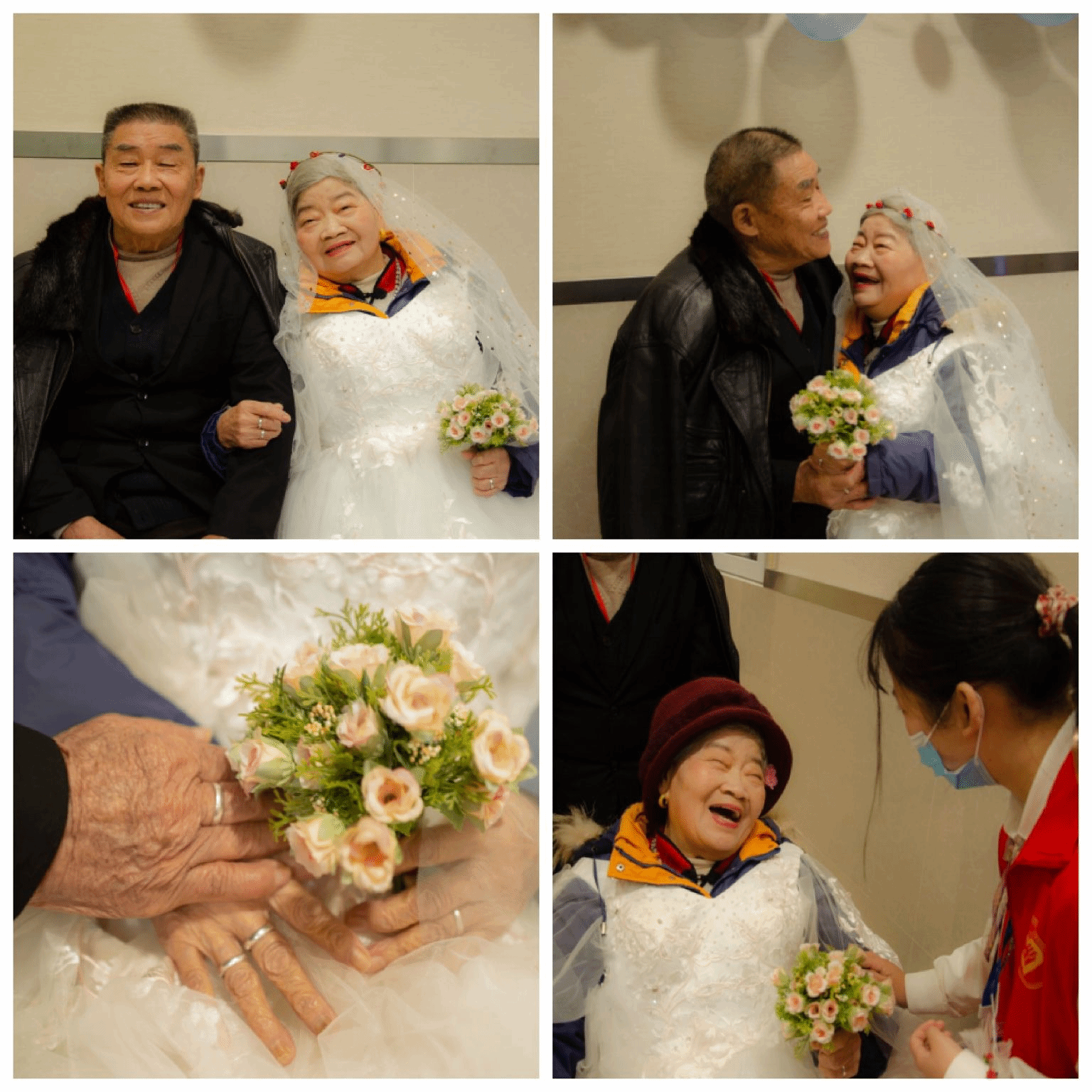 换上西装,精神爽朗的爷爷与奶奶相视一笑,像是回到了当初你侬我侬的景象。奶奶的腿不是很方便,爷爷全程都搀扶着奶奶,奶奶也是一直询问着爷爷,冷不冷,要不要加衣服。站在身旁的志愿者们大概有的只是羡慕了。伴随着咔嚓咔嚓声,主题拍摄也正在进行。虽至暮年,但依然保留着爱情最好的样子。拍摄时的羞涩,是他们青春的回忆,是他们爱情萌芽时的朝阳晓露。结婚时由于经济和技术条件受限没能拥有一张婚纱照,自结婚71年以来也从未一起补拍过婚纱照,甚至连两人的合影都少之又少。这大概就是活动的意义所在吧,为爷爷奶奶补拍婚纱照,追忆曾经逝去的时光和岁月,弥补在年轻时代留下的缺憾,圆他们的“婚纱梦”以此来纪念镌刻在时光中的爱情。