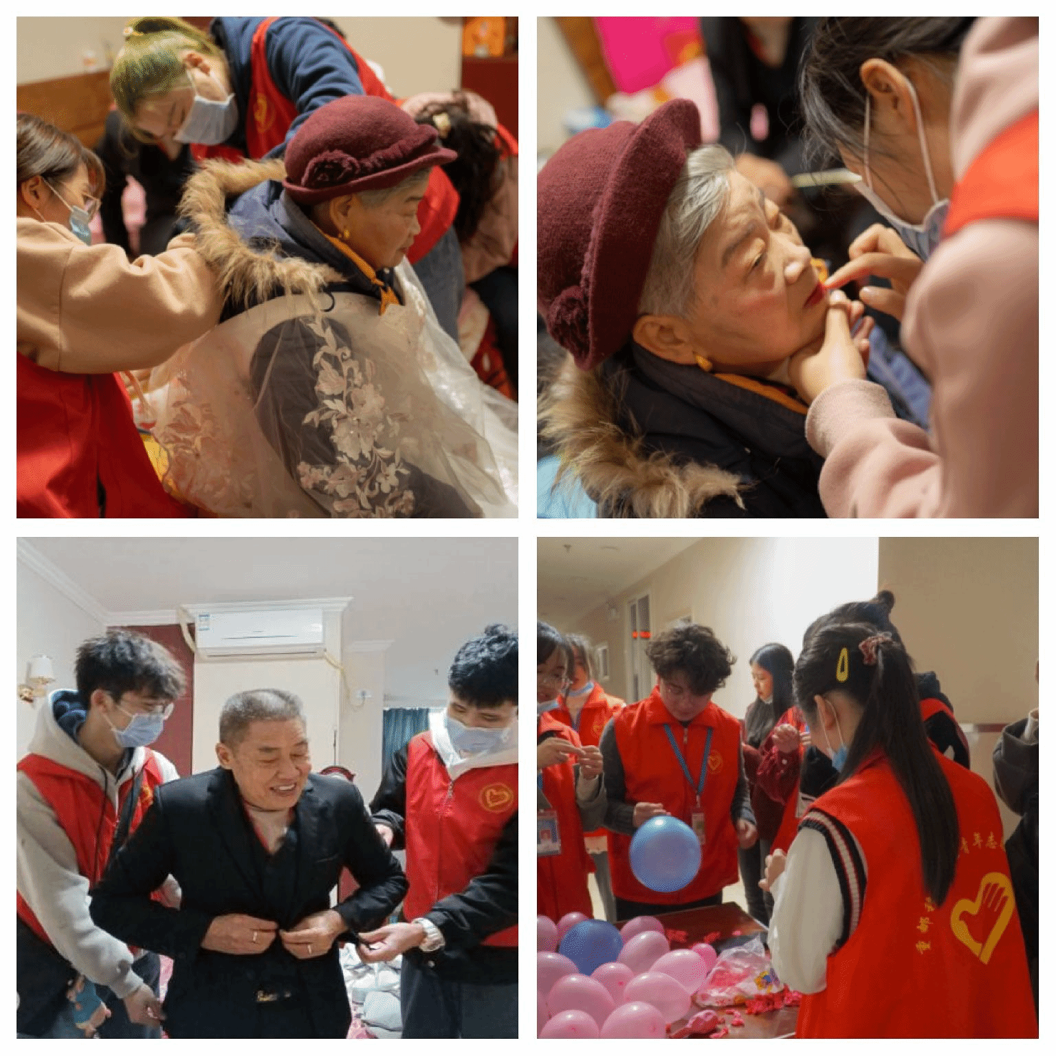 到达目的地之后,在幸福养老公寓工作人员的协同下,志愿者们各司其职、为拍摄老人化妆梳洗、布置拍摄场地等。镜头转向正在化妆的奶奶,满脸洋溢着幸福。在化妆之前我们询问奶奶需不需要化妆时,奶奶的面容像是盛开的牡丹花说道;“要,要画”,瞬间打开了我们的心扉,整个化妆间欢声一片。化妆之余奶奶给我们讲述着他们年轻时的故事,虽然简单,但却是一辈子。在房间里,爷爷没有太多的话语,大多数的目光都落在了奶奶身上,这大概就是余光中先生笔下的所爱皆星河,满眼只有你了吧。七十年的光阴没有争吵,有的只是互相尊重,互相扶持,才有了现在的儿孙满堂,阖家幸福。他们虽然没有现代婚姻时的海誓山盟,但他们之间的陪伴是缱绻无声的誓约。