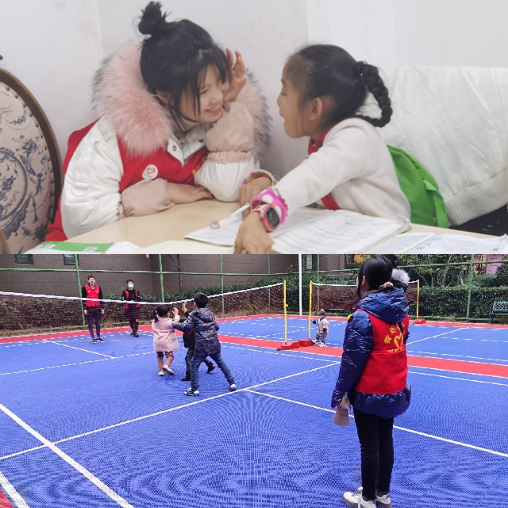 虽然小朋友们来自不同的年级,但聪明这个特质是小朋友们都具有的,志愿者们稍稍一提醒,他们就能做出原本不会的题。有些小朋友作业做得很快,不一会就把作业全部做完了,做完之后他们也不急着回家,而是在办公室里跟志愿者们一起交流、说话。小小的他们虽然还不懂得什么大道理,但他们说的话却很有趣,引得志愿者们也哈哈大笑。另一边,做完作业的小朋友们在志愿者的陪伴下,在室外打起了羽毛球。小朋友们玩得不亦乐乎,志愿者们伴着小朋友们的笑声都露出了温暖的笑容。有的小朋友们两个人一起打着羽毛球,志愿者们就在旁边看着他们,时刻注意着它们的安全。小朋友们可能并不清楚羽毛球的规则,他们凭借着对羽毛球懵懂的印象奔跑着去接球,真实又活泼无比,整个羽毛球场上都充满了小朋友们欢快的笑容。