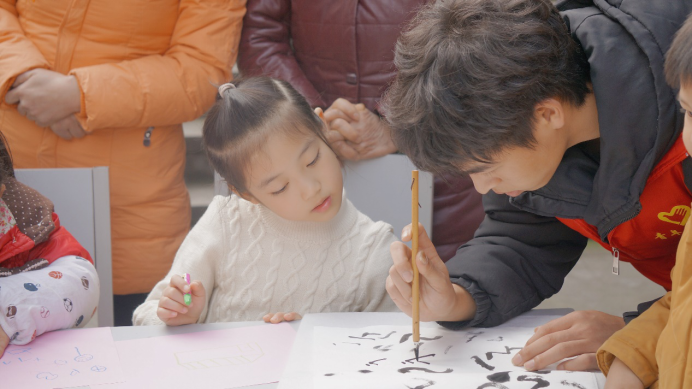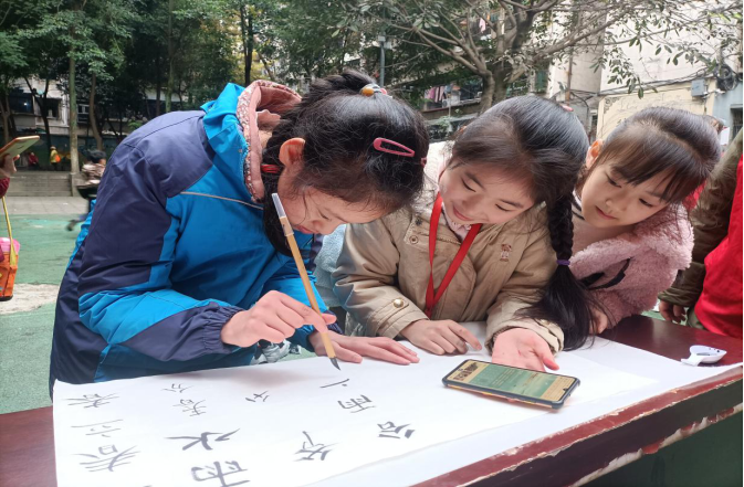 在课堂上,小朋友们表现出足够的好奇心与学习力,在书法教学中,通过志愿者的帮助,慢慢进入状态,聚精会神地在纸上作出自己的书法作品。一张张小小的彩纸蕴藏着的是孩子们专注的心,孩子们通过完成书法作品中获得成就感,潜移默化中在心中埋下了书法文化的种子。
