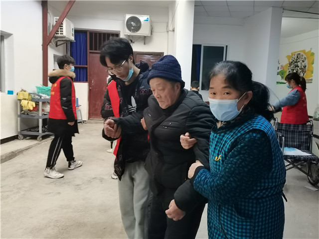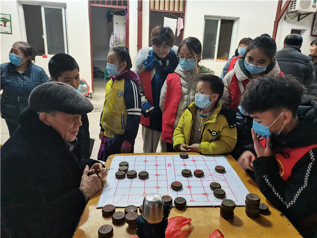 在辅导完所有小朋友们的作业后,志愿者带领小朋友去往东津陀敬老院看望老人。在志愿者带领下,小朋友们陪老人聊天看电视。有老人问小朋友问题,小朋友耐心回答,一直陪着老人聊天,疏解老人无聊的情绪。其中一位志愿者一直陪着老人下象棋,志愿者与老人在棋场你来我往,精彩万分。还有的志愿者帮着敬老院的服务人员扶着老人,帮助老人锻炼身体。小朋友们在老人面前表演,玩游戏,为老人带来了活力和欢乐。老人们的脸上原本因为年老而木然的眼神因为志愿者和小朋友们的到来变得清晰又有神。小朋友和志愿者为冬日的老年公寓带去了一份温暖。