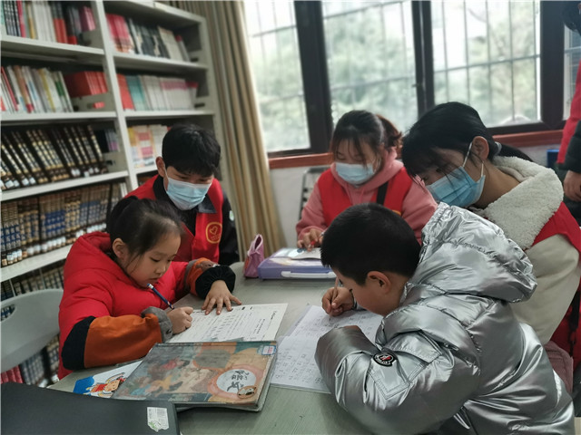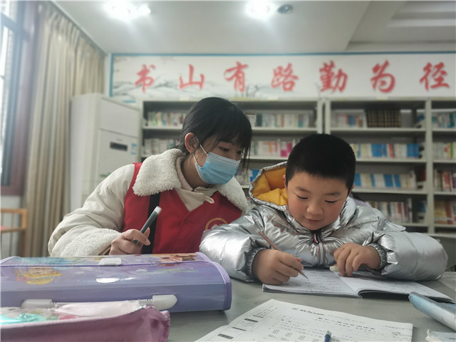 到达社区门口时环境有些意外的冷清,但有两个坐在一旁椅子上的小朋友直接朝志愿者们飞奔过来,在等待社区开门的时间里热情地分享并展示着自己背包里的东西。随后志愿者们带着小朋友们来到了图书活动室,每位志愿者都熟练地寻找到了小朋友进行辅导。只见小朋友们把作业摊放在桌子上,向志愿者指出不能够自己解决的题目,同时志愿者也会耐心地进行回答指导,整个活动室和谐而又安静。