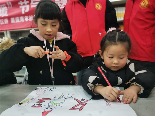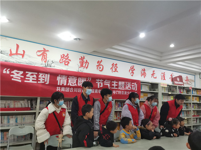 到了中途休息的时候,便有另一队志愿者来开展“冬至到,情意暖”节气主题活动,志愿者们按照指挥将桌椅摆到规定位置,活动以“一圈到底”小游戏展开,首先由三名志愿者进行动作演示,排队手牵手将呼啦圈套过身体。小朋友们通过观看学习,在志愿者们的引导下很快就开始自主排成两列队伍进行比赛,顺利将呼啦圈绕过身体的小朋友不停地给队员呐喊加油,最终双方都取得了不错的成绩。这个环节巧妙的增强了小朋友们的团队意识以及提高他们的集体荣誉感。随后志愿者们站在小朋友们的位置后面协助他们完成接下来与节气有关的快问快答活动,在志愿者们的提示下以及积极活跃的气氛下,小朋友们迅速地回答出了问题并掌握了许多有关二十四节气的知识。在一片欢声笑语中,很快进行到活动的最后一项,志愿者拿出提前打印的有关冬至的手抄报给小朋友们参考,让他们以小组为单位在规定时间内合作进行与冬至有关的手抄报绘画。在小朋友们的画笔下,一片片雪花,一个个雪人,一盘盘水饺都变得鲜活起来,他们运用自己的想象力用画笔在画纸上画出了属于他们的童真稚嫩的一笔。时间一到,各组的小朋友便派代表在志愿者与家长面前展示讲解组内绘画作品。两组的小朋友都完成得很精彩,并且得到了热烈的掌声。活动最后每位小朋友都配合着志愿者们在横幅下进行合影留恋。