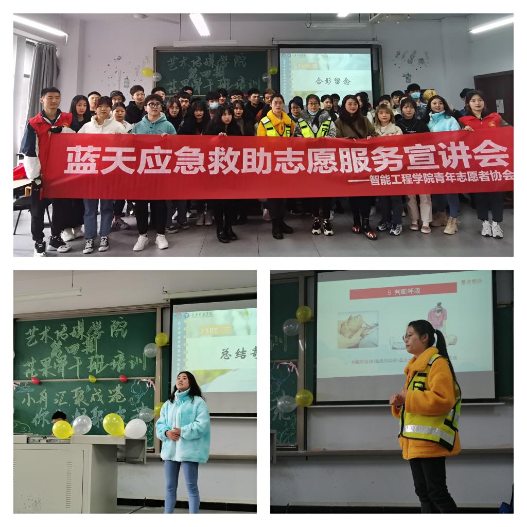 为提升我院志愿者队伍的安全意识和应急救援能力,艺术传媒学院青年志愿者协会于2021年3月9日中午12点开展了第四期花果骨干班培训,此次的培训会特别邀请到智能工程学院蓝天应急救助志愿者服务专项支队为同学们进行心肺复苏急救知识讲解。