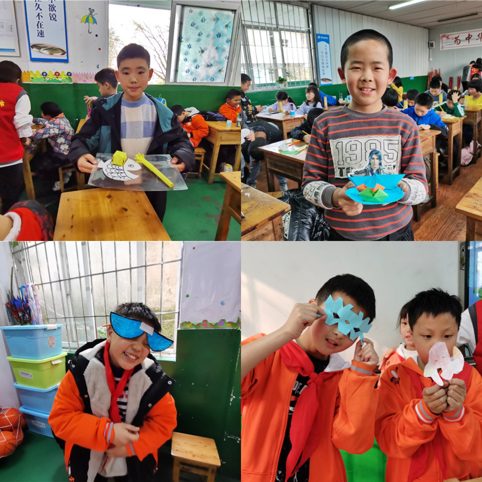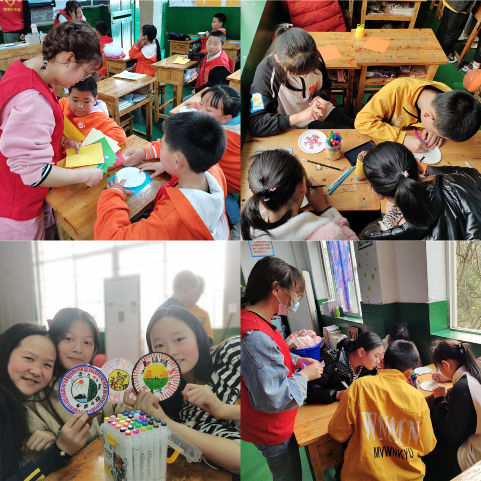 当志愿者们讲解完使用蛋糕纸盘制作手工作品的方法后,就轮到小朋友们自己亲手制作手工了。小朋友们兴致高涨,期待着志愿者们分发蛋糕纸盘以及彩纸等绘制工具。通过小朋友们丰富的想象力和发散的思维,蛋糕盘子在小朋友手中千变万化,有的被制作成西瓜,有的被制作成眼镜,也有的被制作成时尚手提包,而作品上不仅仅是画,还有小朋友们对关爱他们的老师们的祝福,“感恩戴爸、潘妈,罗姐。”这些无不彰显着这群小朋友们不仅仅拥有想象力和创造力,更多的是属于留守家庭孩子们独有的懂事和独立。