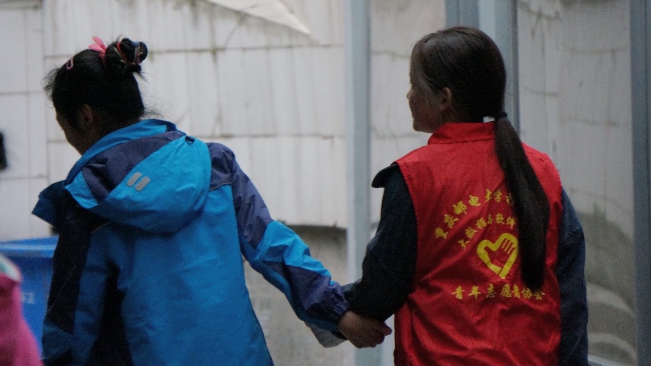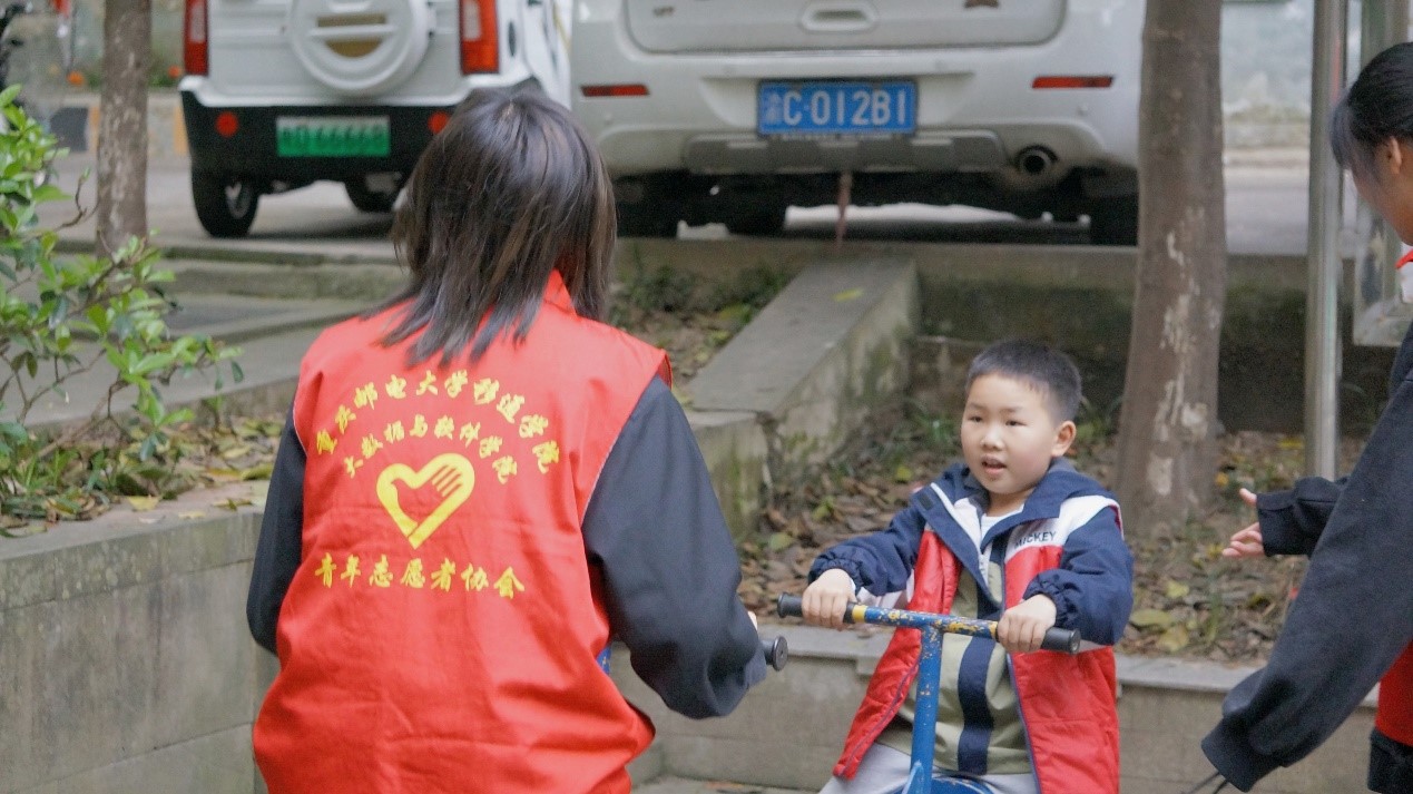 一上一下的跷跷板倾倒这孩子们天真的话语,年龄大一点的孩子会和志愿者靠在墙上倾诉成长的烦恼,有些年龄小一点的孩子会爬到志愿者的背上和志愿者打闹玩耍着。