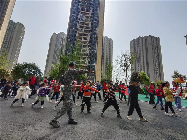 比赛项目结束后,志愿者们将所有的小朋友组织到了一起,“军体拳,格斗准备”。一个响亮的声音响起,然后一个穿着一身迷彩服、正握一把九五式步枪的志愿者小哥哥登场了,小朋友瞬间被他所吸引,一个个都安安静静的,仔细的听着身穿迷彩服的大哥哥讲解关于各种军用枪械的知识,讲解完过后就是教给小朋友军体拳,一开始的演示让小朋友们看得目瞪口呆,纷纷鼓掌。第一动,弓步冲拳,第二动,穿喉弹踢,第三动,马步横挡,小朋友们学得有模有样,尽管这些动作对于他们绝大多数来说比较困难,但是每一个小朋友都在尽力模仿,跟着一下一下的比划。