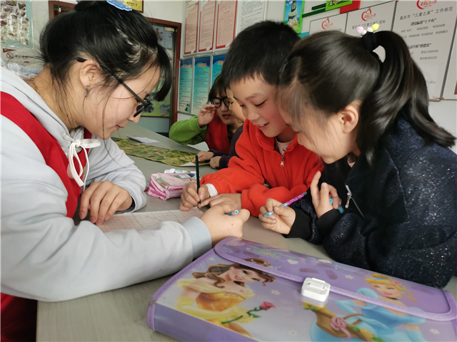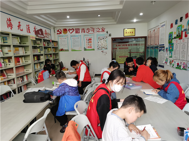 到达了太平门社区后,由于大门还没有及时打开,志愿者们站在在外面稍等了片刻,与提早到的小朋友聊天玩耍。没过多久,小朋友在门被打开后激动的带着志愿者朝里面奔去。进入图书馆,志愿者们都主动找到对应的小朋友进行作业辅导,耐心的给已经做完作业的小朋友批改,指出存在错误的问题并且给予纠正。志愿者在辅导的过程中并不是一味地在给小朋友输出自己的知识储备,相反有时遇到记忆不太深刻的知识点,小朋友们也会积极的像志愿者讲解在学校所学到的知识。在志愿者细心的教导带动下,加上小朋友们认真的配合,学习任务轻松完成了。