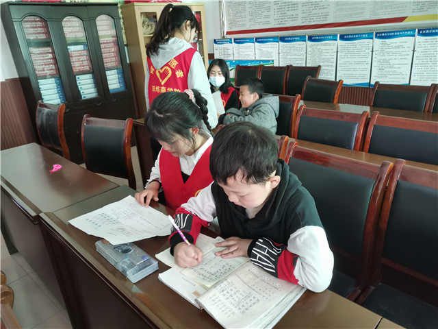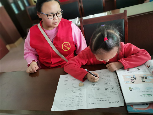 玩闹过后,小朋友们也都自发的坐到课桌前,等待着哥哥姐姐们的辅导。活动室安静的氛围,让小朋友们很快的进入了学习的状态,偶尔夹杂着小朋友们与志愿者哥哥姐姐的对话,一切显得都很温馨。活动的开展有温馨的地方但也有很多的突发情况,小朋友是爱玩的,小朋友之间也难免有打闹,今天的志愿者们就遇到了这样的大难题,但在志愿者们的安抚下,两个吵架的小朋友也都慢慢安静下来,理智的将两个小朋友分开在两个房间做作业,慢慢的安抚,轻声的询问理由,志愿者们用最大的温柔维护着两个小朋友之间的友谊。
