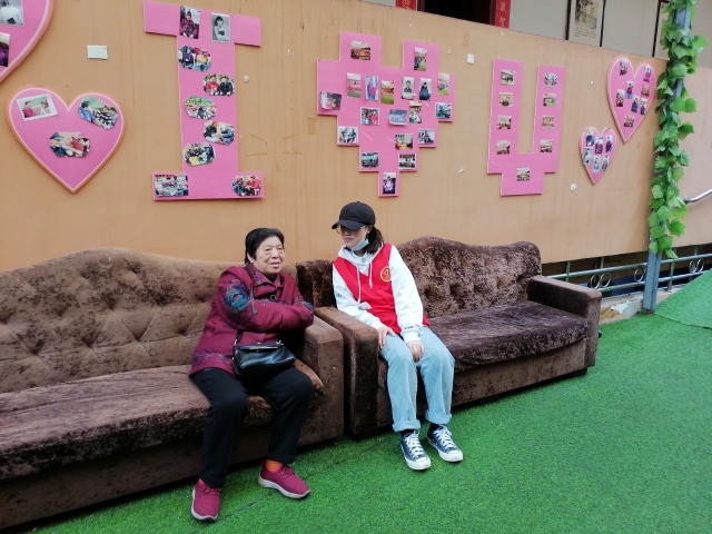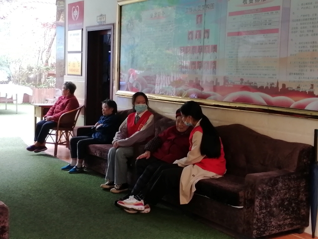 在队长的组织领导下,志愿者们有序排成两路纵队来到康乐敬老院。刚到敬老院,爷爷奶奶就满脸笑容的招呼志愿者们坐下,志愿者们热情的回应着各位爷爷奶奶。志愿者通过与老人们聊天,了解他们的生活现状。主动分享自己的生活趣事,增加老人们与志愿者们的互动。有的老人讲述自己年轻时经历,曾经的生活有艰辛,也有甜蜜,还有在提及老伴时的思念和甜蜜。有的老人也谈论起自己的子女,即使工作生活在不同的城市,但言语中还是充满了骄傲,同时也有思念与无奈。在聊天过程中,志愿者看到奶奶的指甲已经很长了,像是很久没有修剪过了,于是拿出指甲刀为奶奶修剪指甲,奶奶笑着对志愿者说“谢谢”。有志愿者去到楼上与行动不便的爷爷奶奶围坐在一起,拉着手,聊着天,了解他们的生活状况,分享着各种趣事,空气中充满着笑声。即使天气微凉,但是志愿者们带来的温情一直都在。