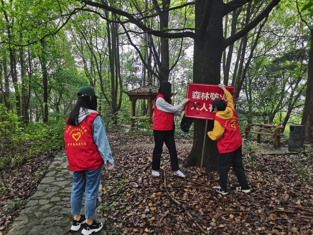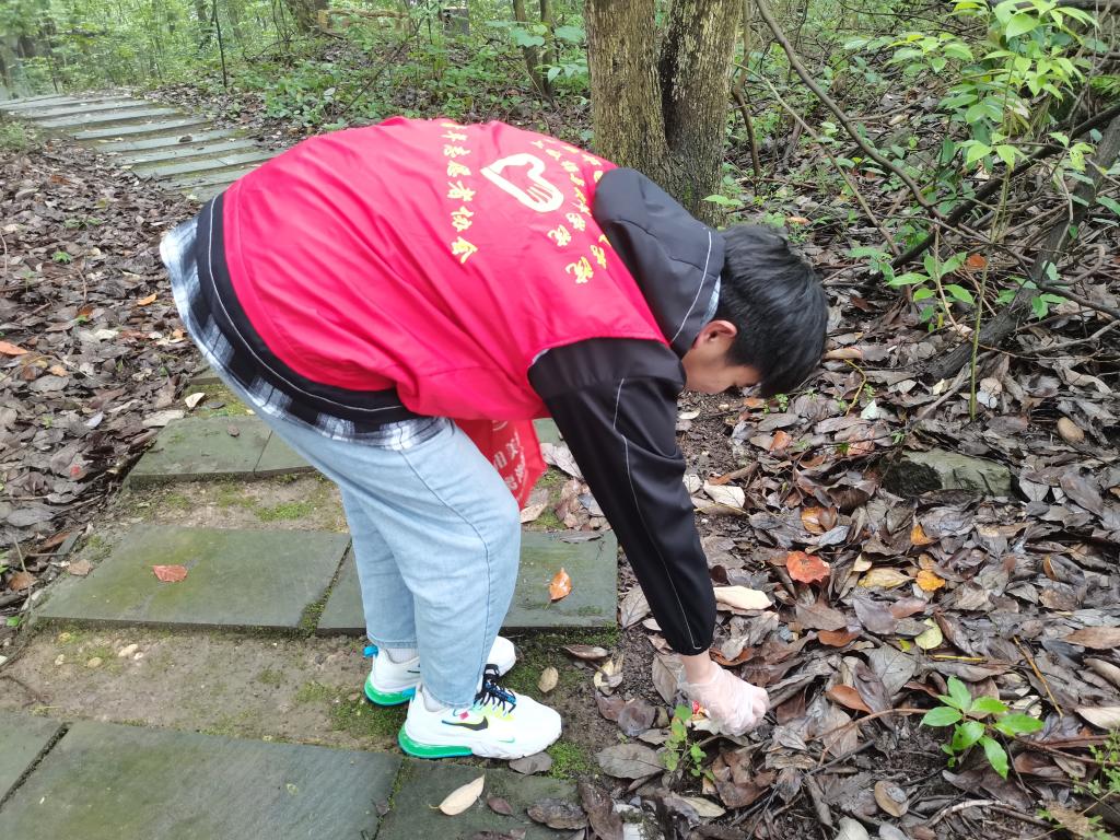 志愿者们即使面对危险而又溜滑的阶梯,也尽职尽责的四处寻望垃圾并拾取其进垃圾袋中。即使是被盖上了一层厚厚树叶的环保标识牌,也被细心的志愿者们发现了,她们将牌子从树叶中举起来,并仔细地将牌子上的枯枝散叶用自己的双手擦拭掉,牌子上写的是“森林防火,人人有责”。她们要用自己的双手让自己加深对保护环境的意识,更好地宣传环保的重要性。