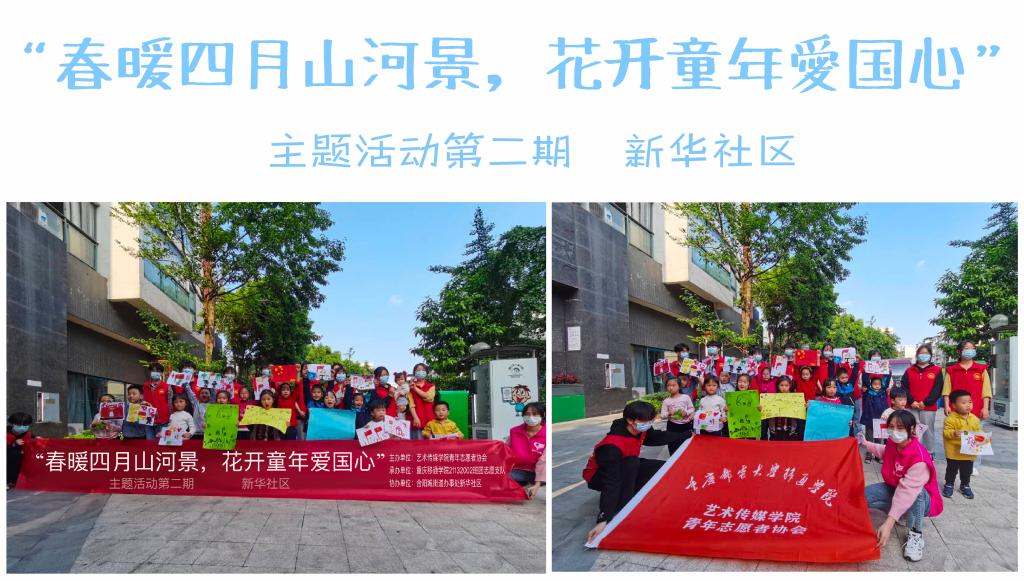 2020年4月21日,阳光正好,微风不燥。艺术传媒学院青年志愿者协会的志愿者们携手重庆移通学院21132002班团志愿服务支队共同走进新华社区,开展“春暖四月山河景,花开童年爱国心”第二期主题活动。
