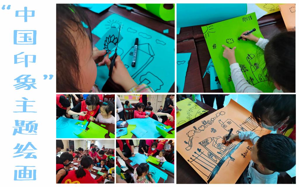 心中有爱,眼里有光,小朋友们在看到各种彩色绘画工具的那一刻,脸上的笑容瞬间绽放。在告知活动主题绘画题目后 小朋友们纷纷拿起画笔,展开想象,进行绘画作品创作。志愿者们在旁关注小朋友的动态,对绘画过程中的小朋友给予帮助。不久,“北京天安门”“五星红旗”等“中国映象”作品纷纷在纸上展现开来。