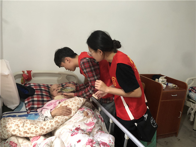 到达目的地后,就进入了工作状态,在不明白活动的注意事项前大家都很拘谨,通过以老带新的方式,很快鱼城书院来的小伙伴也适应了,一些人找到单个的爷爷奶奶聊天、解闷;一些人去为那些瘫痪在床上的爷爷奶奶喂饭;还有人就是拍照记录志愿者工作时的样子。在给行动不便的爷爷奶奶喂饭时,通过与护工的交流了解到了爷爷奶奶的年龄和病情,说者无意,听者有心,句句话落到了年轻的志愿者心里,人到了老年,各种病都容易出现,以后要是咱自己老了,会不会也这样,感慨了一下,还是笑着鼓励爷爷笑着面对生活。