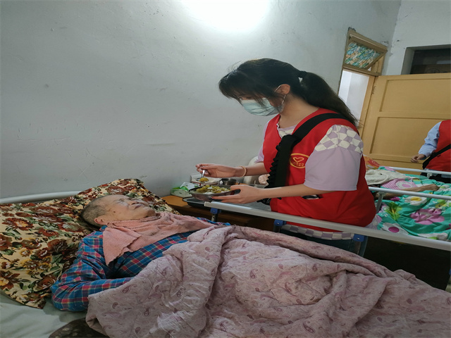 时间到了五点钟,便到了老人们的晚餐时间。有的老人因为生病的原因不能自己进食,平时都是养老院的护工阿姨给他们喂饭。志愿者们便自发的给那些不能自己吃饭的老人们喂饭,护工阿姨对志愿者们更是称赞有加。一会儿去厨房给爷爷奶奶端饭端菜,一会儿给爷爷奶奶擦嘴,整个养老院都是红马甲的忙碌的身影。