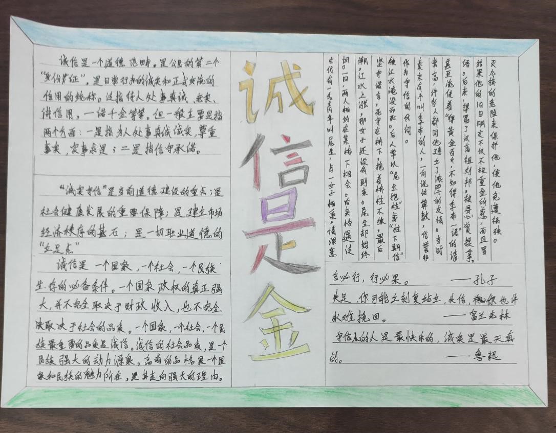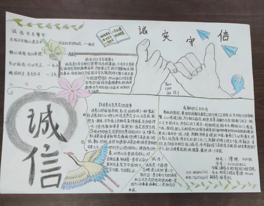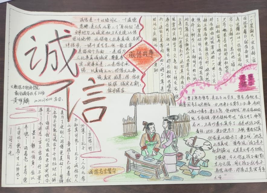 诚信手抄报它兼具语言和绘画的优点,通俗易懂的同时具有艺术性。此次“我们与诚信有个约定”班级公约活动大数据与软件学院有 23个班级参与,48等多名学生参加。参与者在志愿者的带领下,对本次班级公约活动有了更深入地了解,逐步扫清诚信知识盲区,极大地提高参与者的积极性。这使得本次班级公约活动手抄报的质量大大提升。在经过多次评选后,“诚信伴我行”、“诚信是金”等手抄报,凭借独特的绘画风格和丰富的内容在本次“我们与诚信有个约定”诚信班级公约活动中脱颖而出,成功进入决赛的班级诚信黑板报活动。