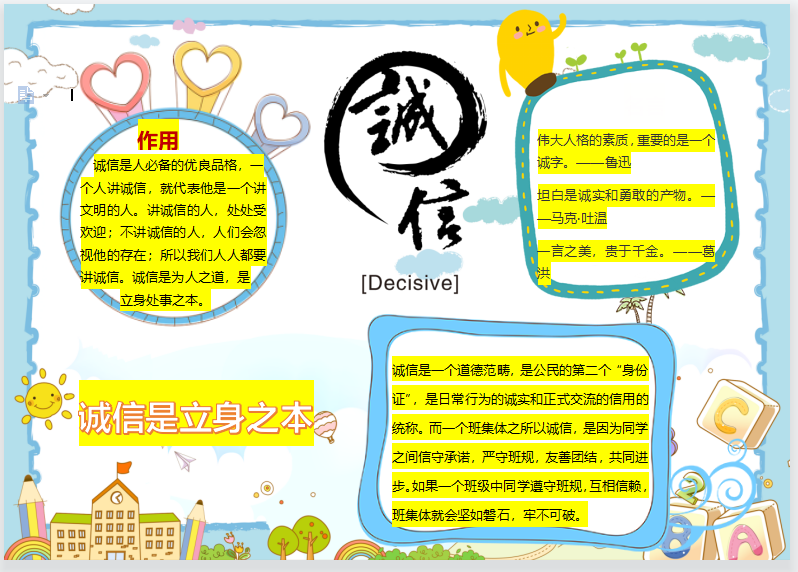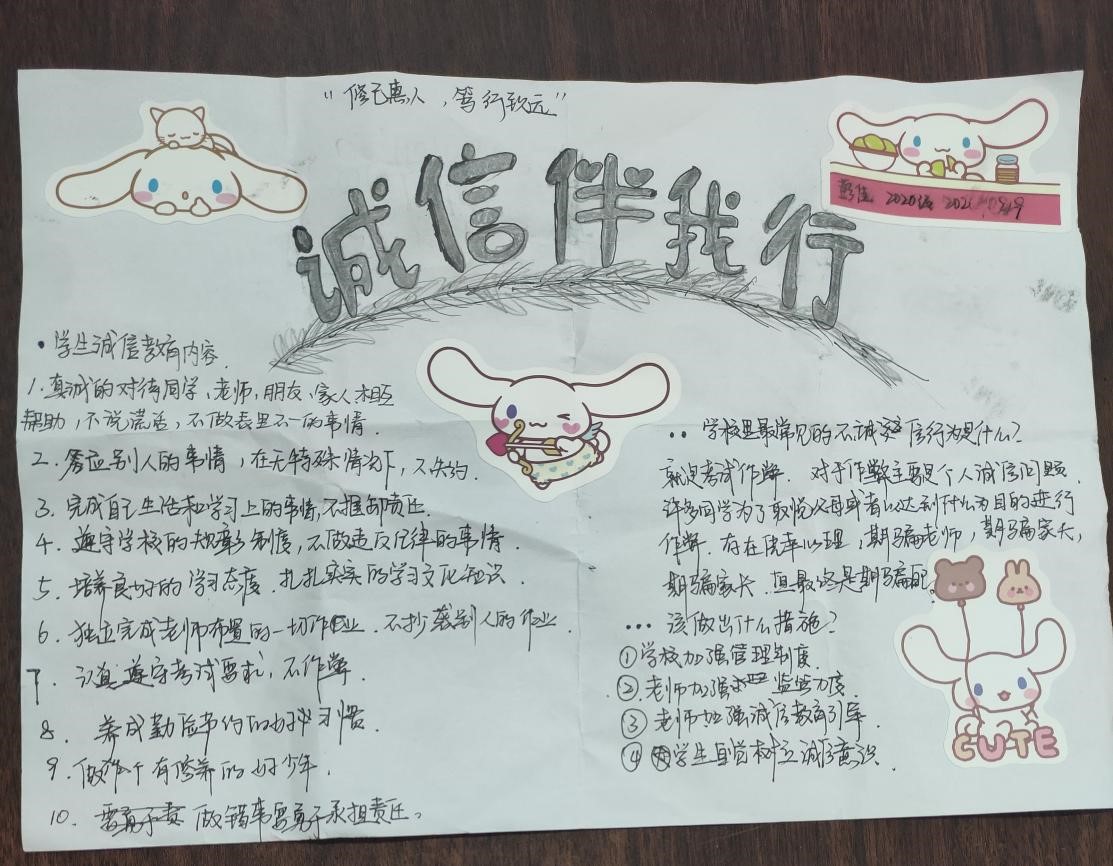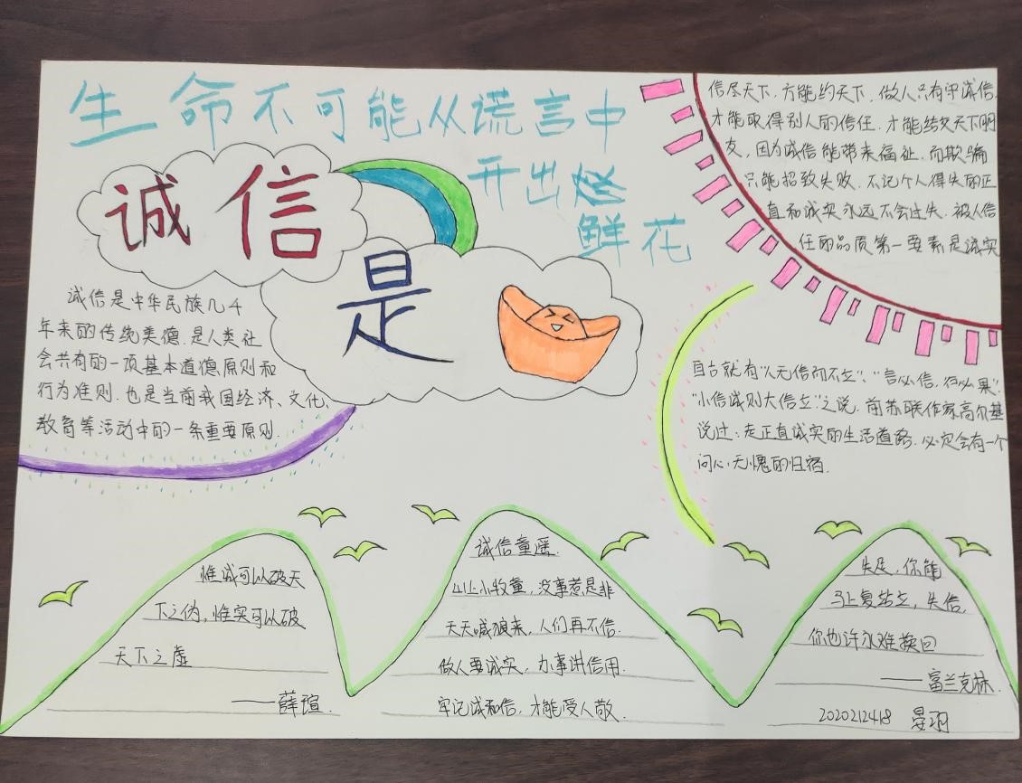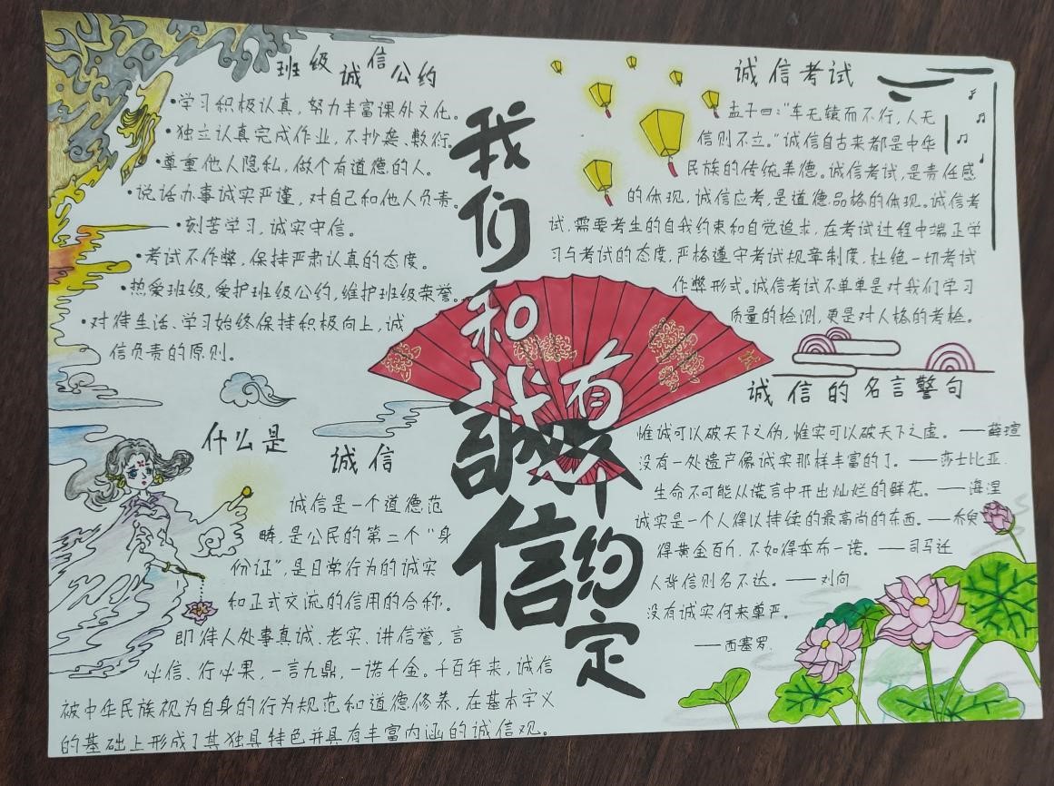 孔子云“人无信而不立,业无信而不兴”。诚实守信是为人之本,做人是否诚实守信,是一个人品德修养状况和人格高下的重要表现,是能否赢得别人尊重和友善的重要前提条件,也是衡量一个人品德修养状况和人格高下的重要标准。本次“我们与诚信有个约定”诚信班级公约活动以诚信手抄报的形式开展的,意在培养同学们的思想价值观。