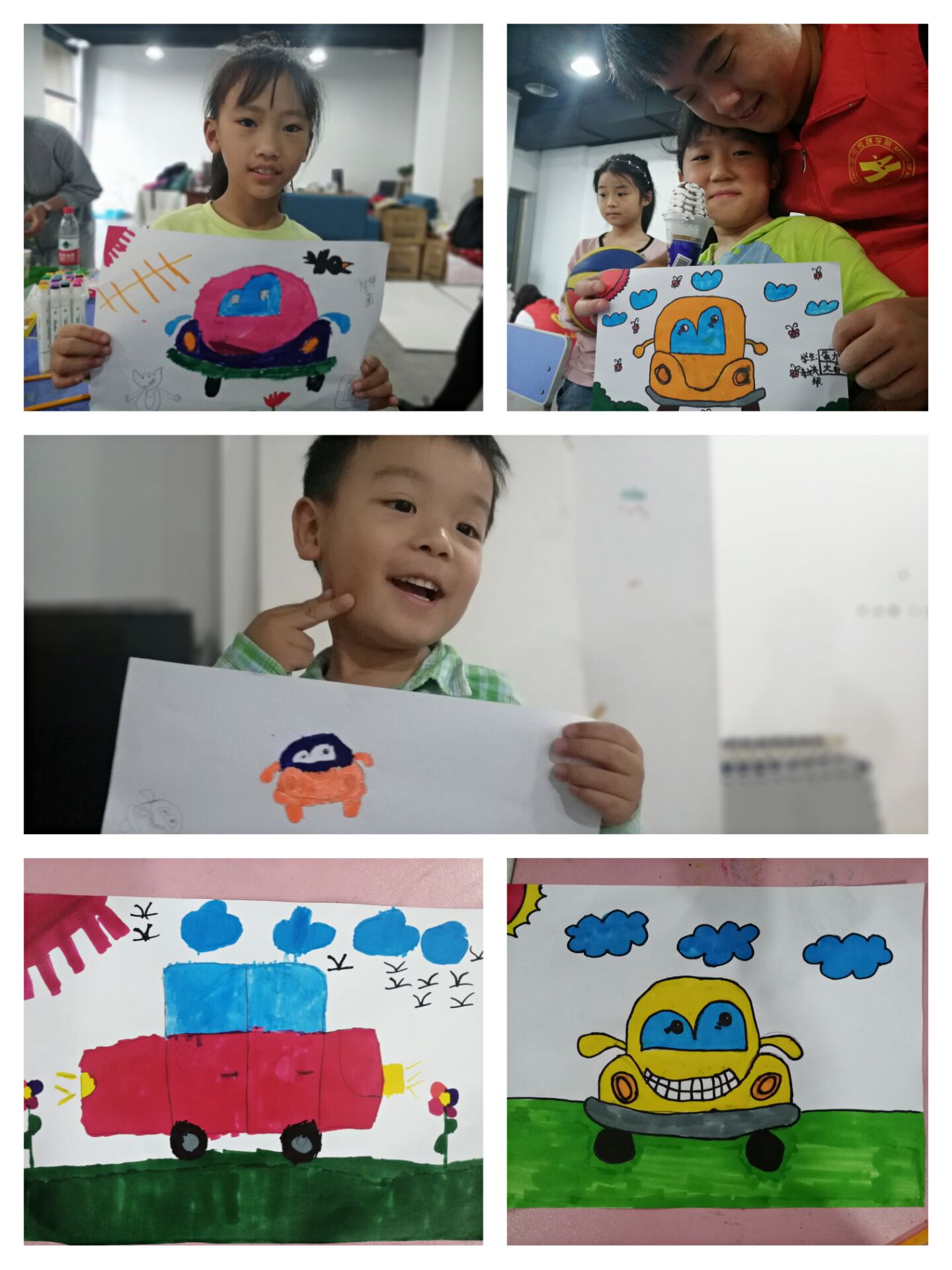 主讲志愿者简单的介绍后,开始了今天的绘画课程。在主讲人的讲解与志愿者们的带领下,小朋友们一笔一画,一点一线的绘制着卡通小汽车。小朋友们在志愿者们悉心的指导下,先后完成了自己的作品。并上台进行分享。