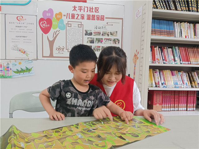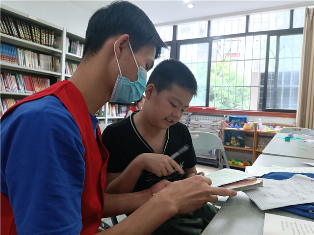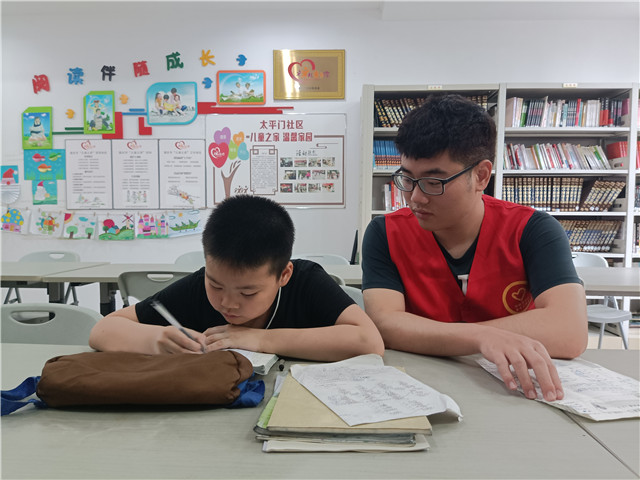 跟随着公交车的轨迹,志愿者们像往常一样迈着轻快的步伐来到太平门社区门口,在不远处就看见一些模模糊糊的身影,背着小书包,迈着小步伐,有说有笑地向志愿者们走来,虽背影模糊,但志愿者们仍能从小朋友们清脆如银铃般的笑声中,一秒就能认出小朋友们,这是志愿者们与小朋友之间的默契感,小朋友们一看见志愿者哥哥姐姐们就露出甜甜的笑容,笑容是纯真无瑕的,他们慢慢走到图书馆二楼,大手牵小手,十分有爱,小朋友们有序乖巧地坐在自己的座位上,拿出自己书本和作业,各自写着自己的作业。