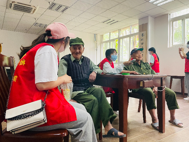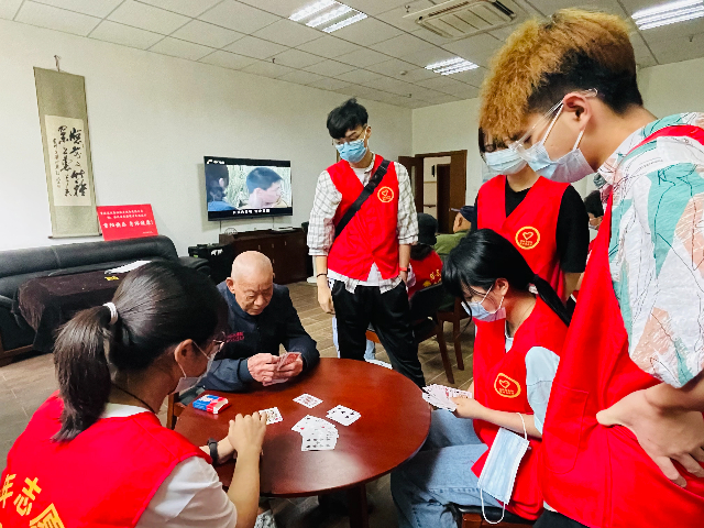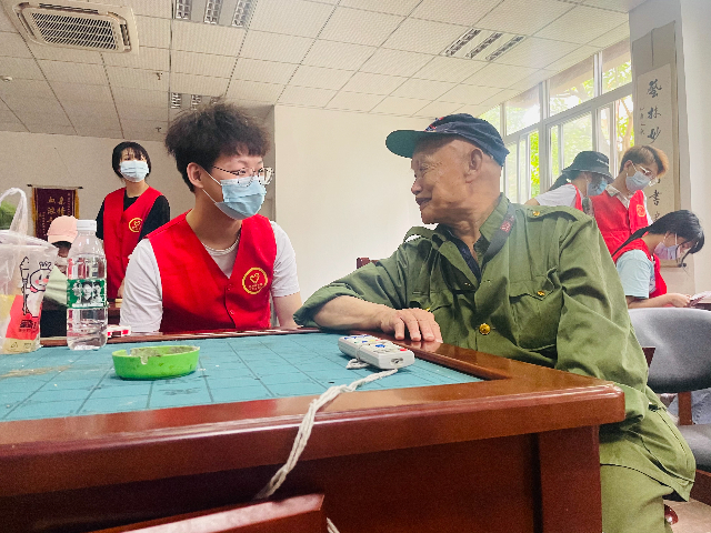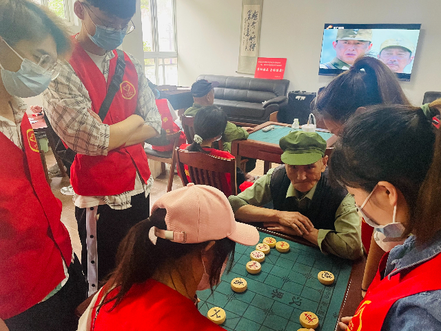 风儿吹落了树叶,却吹不走志愿者的热情。志愿者们分工明确,有些志愿者陪着老人们逛一逛后山,和老人聊聊天,老人洋溢着灿烂的笑容给我们介绍着这里的一花一草。而有些志愿者陪着老爷爷下象棋、玩扑克,丰富老人们的生活。这短暂的下午给志愿者们和老兵们带去的快乐和温暖是无限的精神财富。
