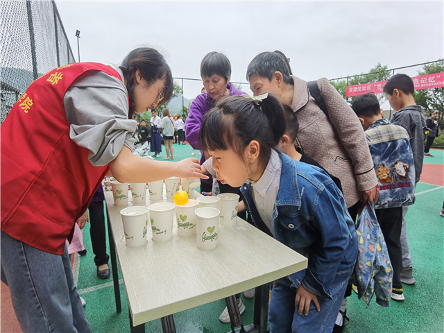 吹乒乓球和套圈游戏,这两个活动是大多数孩子喜欢的,但是都是需要技巧的游戏,看似简单实则很难,吹乒乓球游戏,在一列五个纸杯只要吹到三个就算成功,但是很多小朋友不是一口气将球吹飞,就是吹不到第三个纸杯,而套圈则需要控制力度与丢的方向,在志愿者们的帮助下,都能成功地完成了!敲锣游戏,这也是游戏的最后一个项目,当小朋友们手上集齐前面玩的游戏的4个印章,再完成敲锣游戏,仿佛在预示着完成了所有的游戏,成为了大赢家!最后带着五个印章前往礼品处领取最后的大奖!