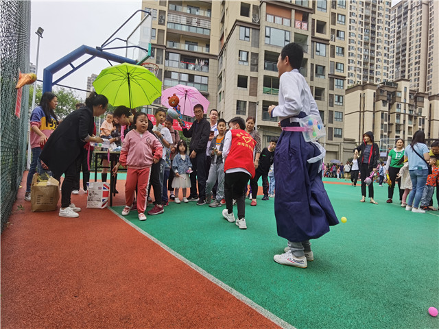 打球游戏,每位参赛的小朋友需要在腰部绑定抖球的道具,盒子中有10个球,参赛的小朋友需要不停地抖动身体使其带动小盒子上下运动,才能将小球抖出,抖出5个算成功。玩这个活动的大多数是男孩子,一个两个争先恐后地要跟自己的好友“比赛”看谁先摇出来,势要争个高下!