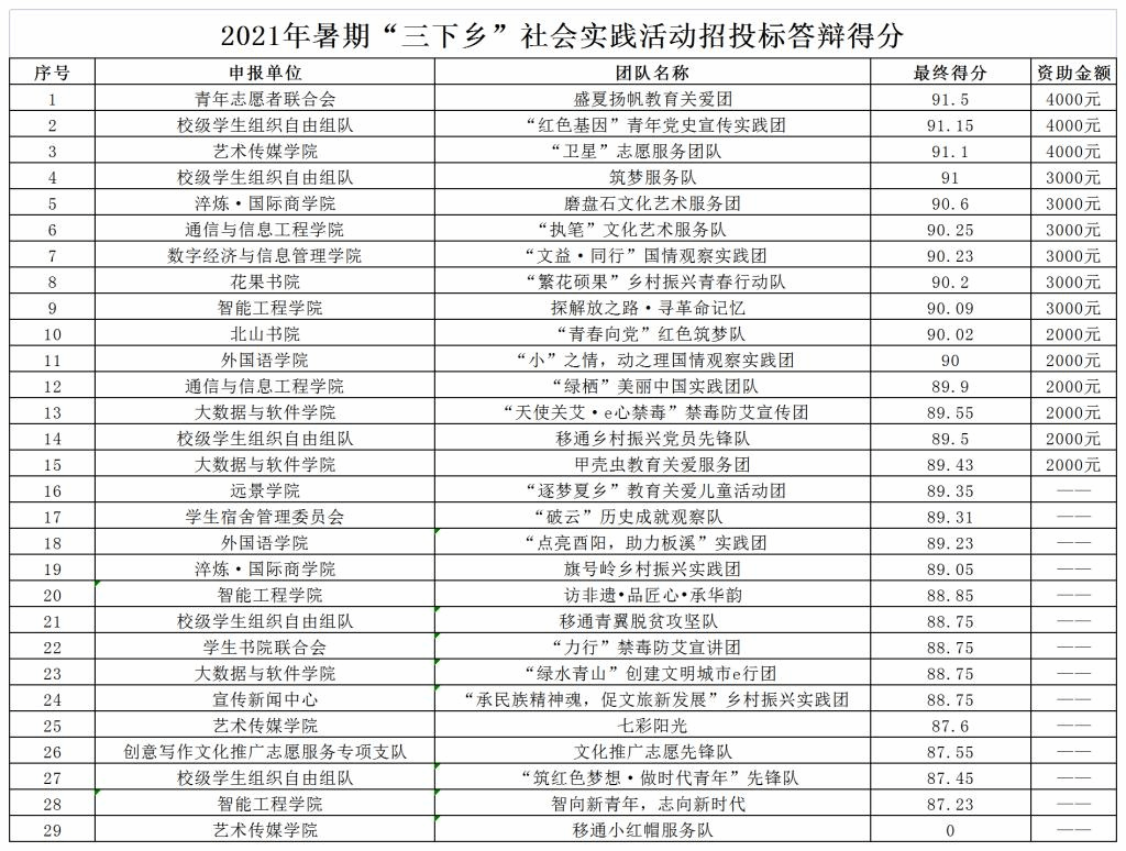 2021年暑期“三下乡”社会实践活动招投标答辩得分表
